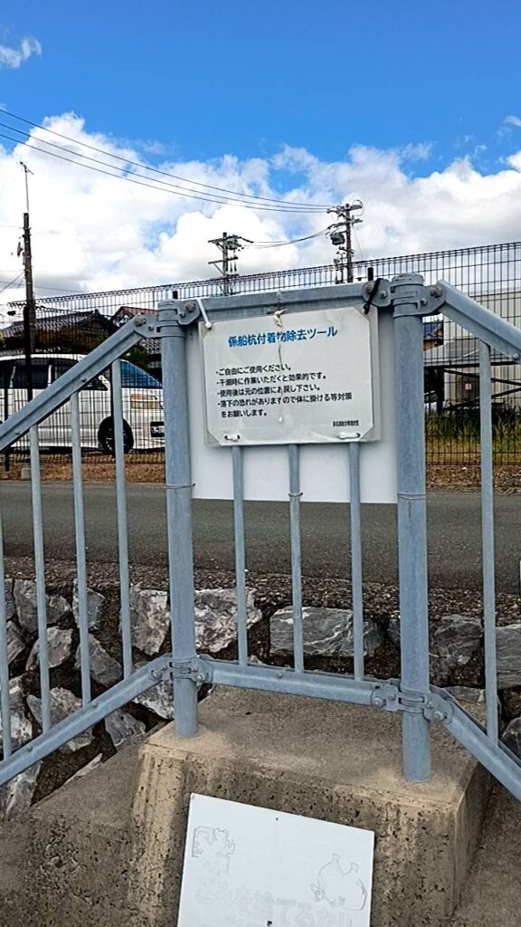本施設に設置しております「係船杭付着物除去ツール(牡蠣殻やフジツボを取り除く道具)」につきまして、現在返却が確認できておりません。