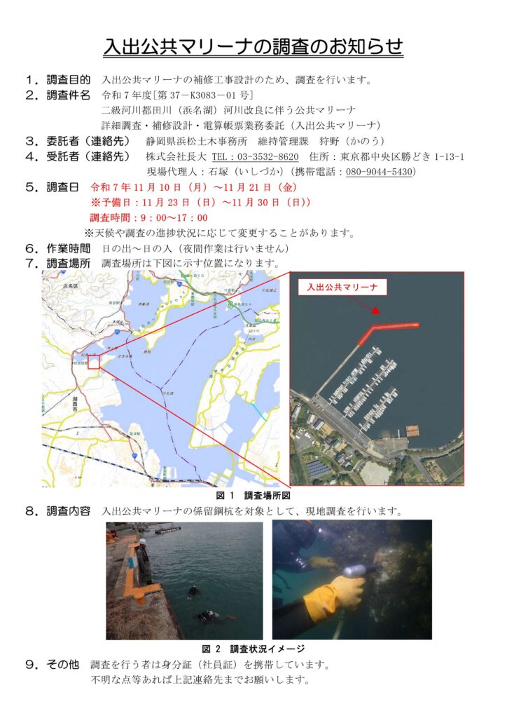 入出公共マリーナにおける調査のお知らせ(浜松土木事務所) 2025年11月6日 by hamanako-zaidan 補修工事設計の一環として、入出公共マリーナにおいて外郭護岸の調査を実施いたします。調査期間中は、マリーナへの出入りの際に十分ご注意くださいますようお願い申し上げます。皆さまのご理解とご協力を賜りますよう、よろしくお願いいたします。