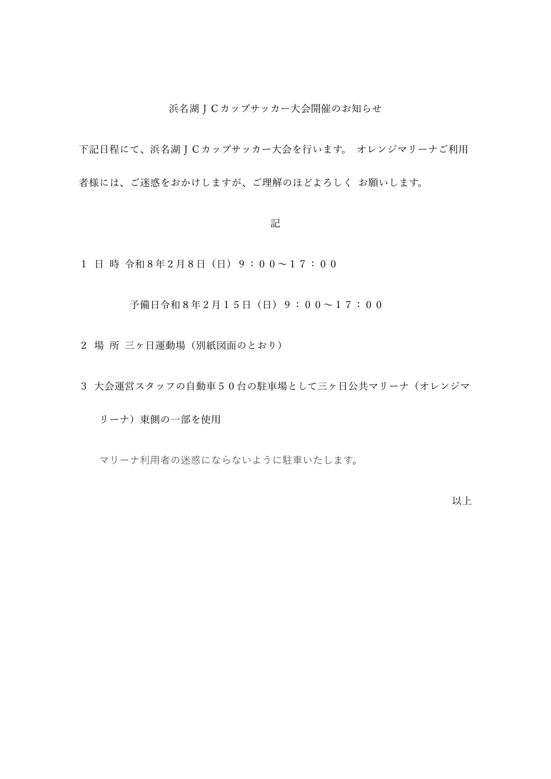 サッカー大会開催に伴う、三ケ日公共マリーナ駐車場の一部利用制限について(三ヶ日FC)その2