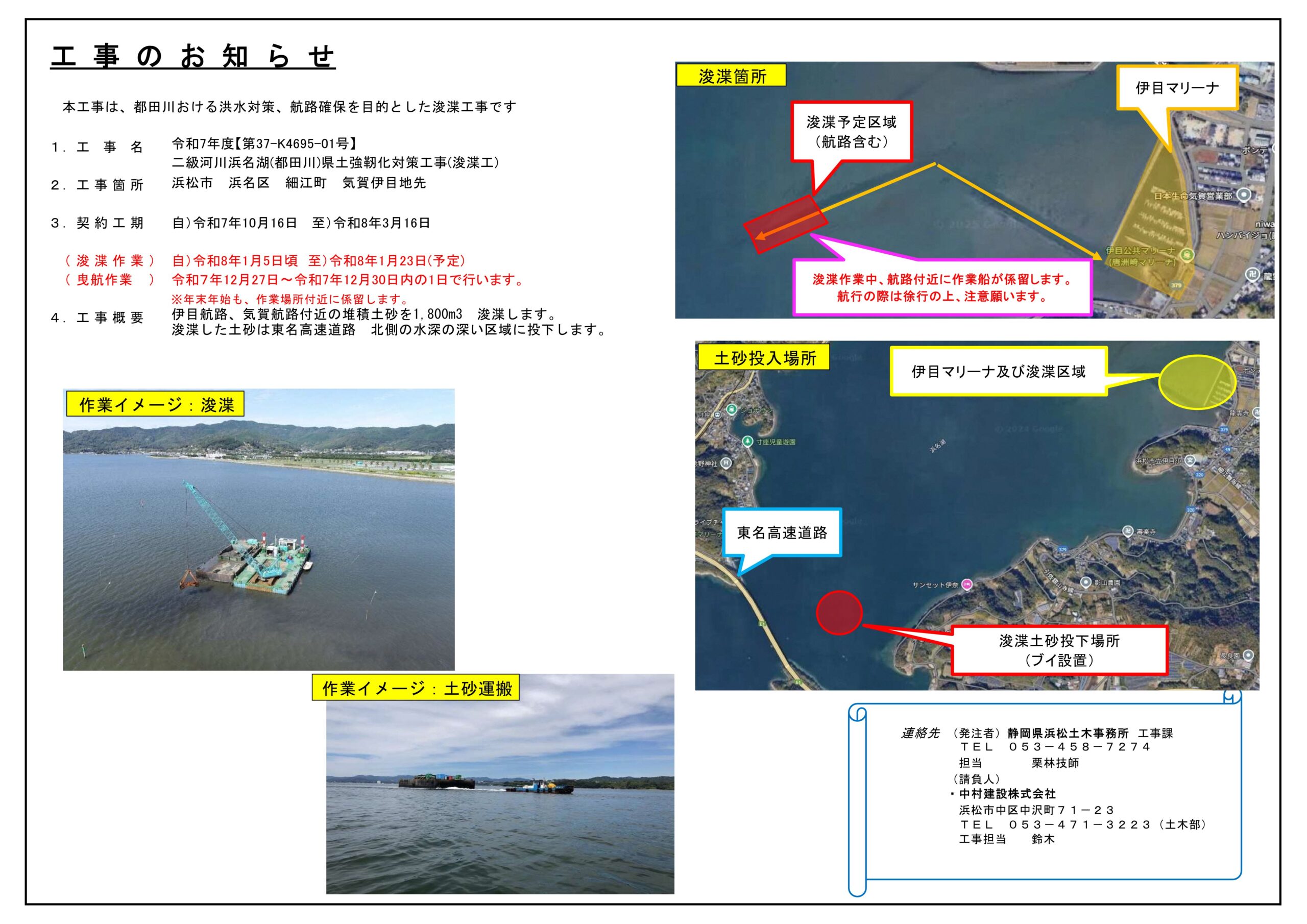 【航行注意】伊目・気賀水路付近において、浜松土木事務所による浚渫工事が実施されます。年末年始には、浚渫箇所付近に作業船が停泊します。お近くを航行の際は、十分なご注意をお願いいたします。 【連絡先】(発注者)静岡県浜松土木 … 続きを読む