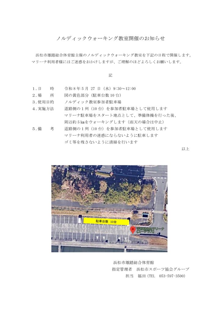 宇布見公共マリーナ駐車場の一部につきまして、浜松市雄踏総合体育館が開催するノルディック教室の参加者用駐車場として、一時的に使用されますのでお知らせいたします。