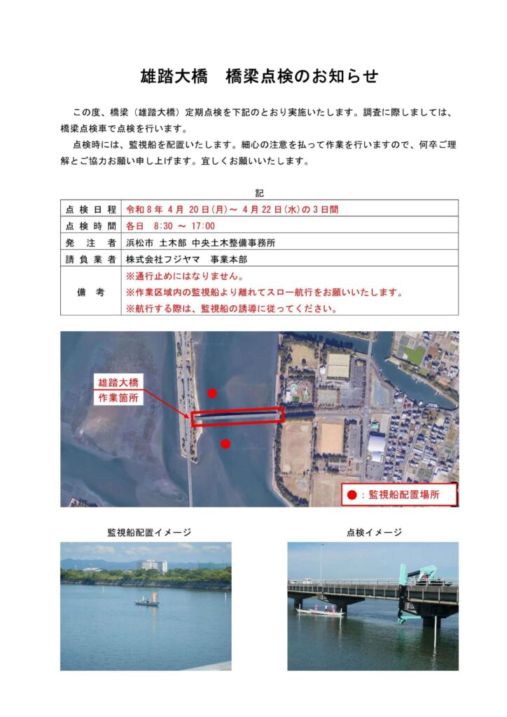 雄踏大橋における橋梁点検のお知らせ(浜松市役所) 2026年4月6日2026年4月6日 by hamanako-zaidan 【航行注意】周辺を航行される場合は、十分ご注意ください。航行する際は、監視船の誘導に従って頂きますようお願いします。